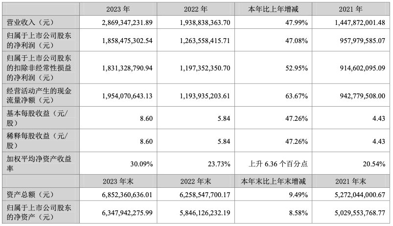 3月20日,愛美客發布2023年年報,報告期內(nei) 實現營業(ye) 收入28.69億(yi) 元,同比增長47.99%;歸母淨利潤為(wei) 18.58億(yi) 元,同比增長47.08%;銷售毛利率為(wei) 95.09%,同比上升0.25個(ge) 百分點。同時,向全體(ti) 股東(dong) 每10股派發現金紅利23.23元(含稅)。