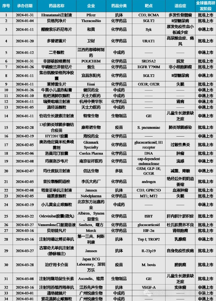 2024年第一季度,根據國家藥品監督管理局藥品審評中心(CDE)公示,共34個創新藥首次提交上市申請(NDA/BLA),其中涵蓋化學藥物17種,抗體藥物5種,疫苗2種,多肽藥物1種,生長激素類生物製品2種,中成藥7種。這些潛力藥物有望於未來一段時間在國內獲批並影響整個市場格局。