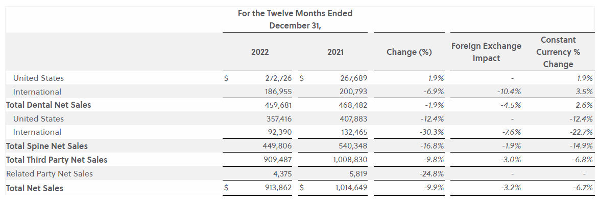 因為在相當長的一段時間裏,ZimVie脊柱業務都處於虧損狀態。財報顯示,自2022年3月ZimVie完成剝離正式上市的首年(截止2023年3月1日)中,脊柱、牙科兩大業務板塊雙雙下滑,全年總營收為9.095億美元(約65億人民幣),同比-9.8%。其中,牙科業務淨銷售額為4.6億美元,同比減少了880萬美元。脊柱業務淨銷售額為4.5億美元,同比縮減9050萬美元。