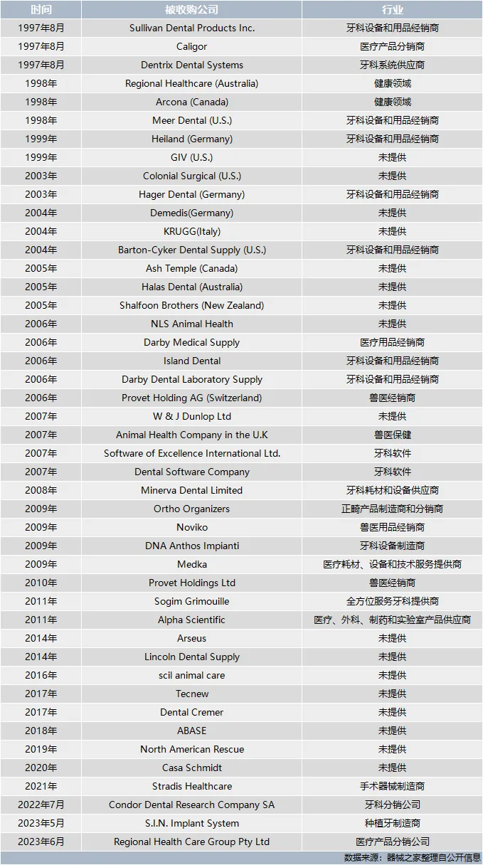 資料顯示,漢瑞祥是一家成立近百年的醫療械企,公司在1997年以3.18億美元收購 Sullivan Dental Products公司一舉成為全球最大的牙科設備和用品經銷商。此後的25年中公司又陸續收購了超過40家企業,不斷鞏固自身“龍頭”的地位。此次收購旨在補充漢瑞祥的牙科耗材和設備業務的同時,推進該公司的“BOLD+1”戰略。