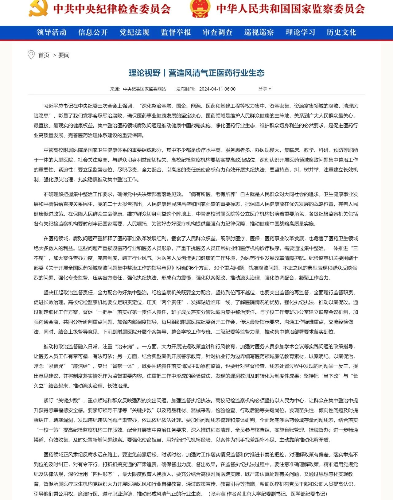 文章指出,在醫藥領域,腐敗問題嚴重稀釋了醫藥事業改革發展紅利,蠶食了人民群眾權益,既掣肘醫療、醫保、醫藥事業改革發展,也危害了醫藥衛生領域絕大多數人的利益。這些問題嚴重損毀醫藥行業和醫務人員形象,嚴重幹擾醫務人員正常執業和醫療機構診療秩序,需要通過集中整治。