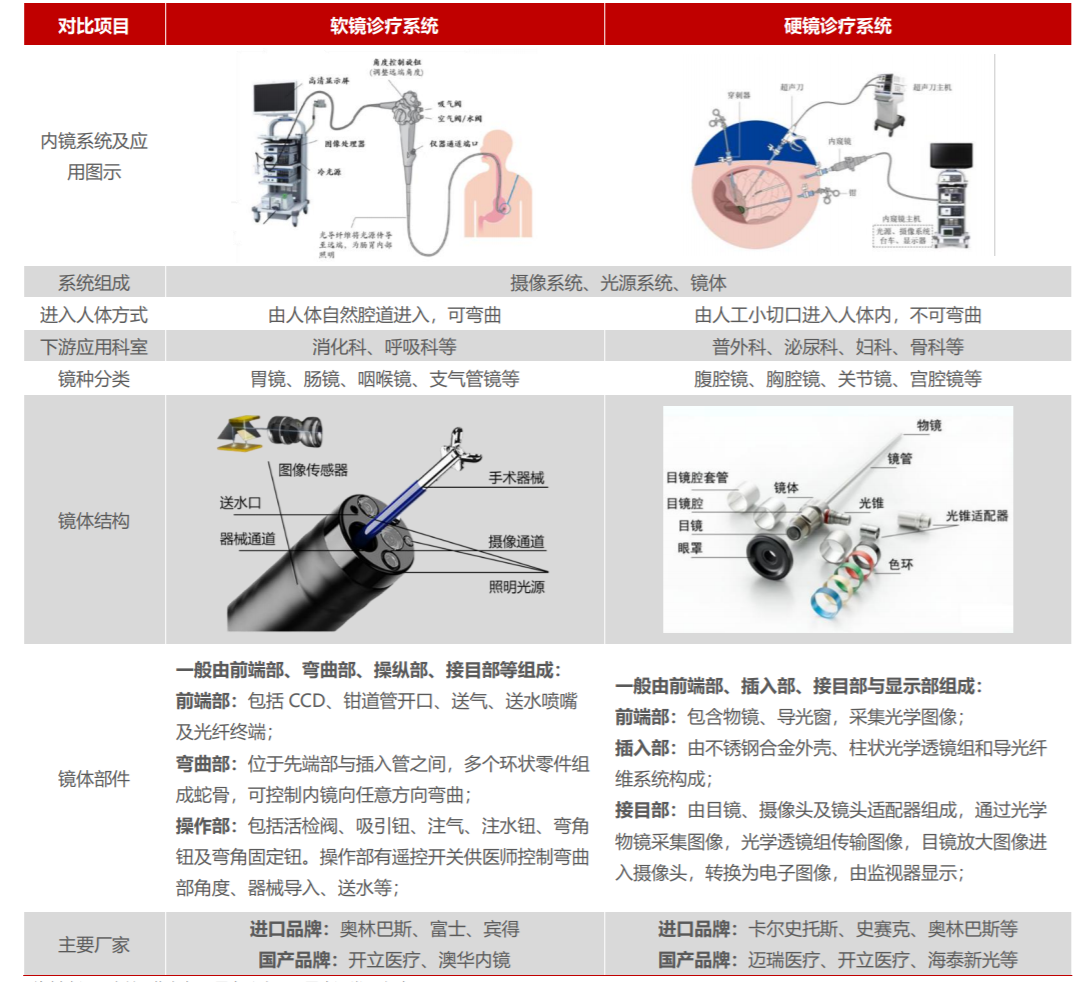 硬鏡設備核心技術在於光學、攝像、圖像處理算法。硬鏡主機的冷光源所發出的光經鏡體的導光通道導入受檢體腔內,反射光經鏡體內的光學透鏡組導出體外,圖像傳感器將接收到的反射光轉換成電信號,再由圖像處理器對圖像信號進行算法後處理,在監視器上顯示出腔內圖像。手術醫師在圖像的引導下,於腔外使用微創手術器械來完成手術。