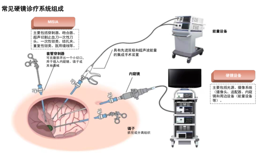 硬鏡係統包括主機、鏡體、微創耗材(MISIA)、周邊設備等。狹義上的“硬鏡設備”由主機(圖像處理器、光源、台車及顯示器)、鏡體(腹腔鏡、胸腔鏡等)組成,但在實際使用中,需要和微創耗材(穿刺器、結紮夾、電凝鉗等)、周邊設備(送氣設備、送水設備、消洗設備等)組成硬鏡係統才能完成微創外科手術。廣義上的“硬鏡設備”包括主機、 鏡體和周邊設備。