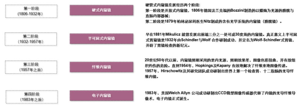 內窺鏡至今已有200多年曆史,內窺鏡的發展大致分為四個階段:硬式內窺鏡、半可曲式內窺鏡、纖維內窺鏡和電子內窺鏡。纖維內鏡使用光導纖維傳遞圖像。電子內鏡將圖像傳感器置於內鏡前端,圖像傳感器將光學圖像轉變為電信號,圖像處理中心將電信號處理後存儲,在顯示器上還原出圖像。
