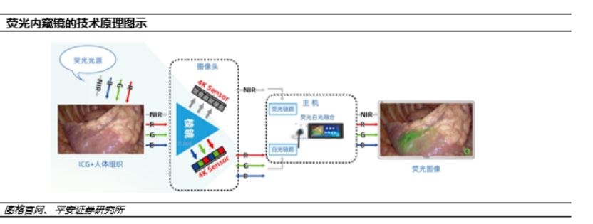 根據工作光源波長的不同,可以將硬鏡分為白光硬鏡和熒光硬鏡。熒光硬鏡能對腫瘤、 血管等不易觀察的部位進行可視化,使用對人體無毒且親和性好的吲哚菁綠(ICG)作為 近紅外(NIR)成像的外源熒光染料。ICG 進入人體後能夠有選擇性地標記癌症病變部位, 被 NIR 激發後可發射熒光,攝像頭實時捕捉熒光,將圖像呈現在監視器上。