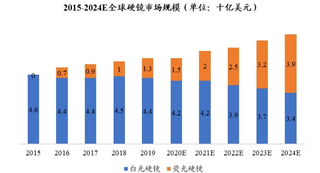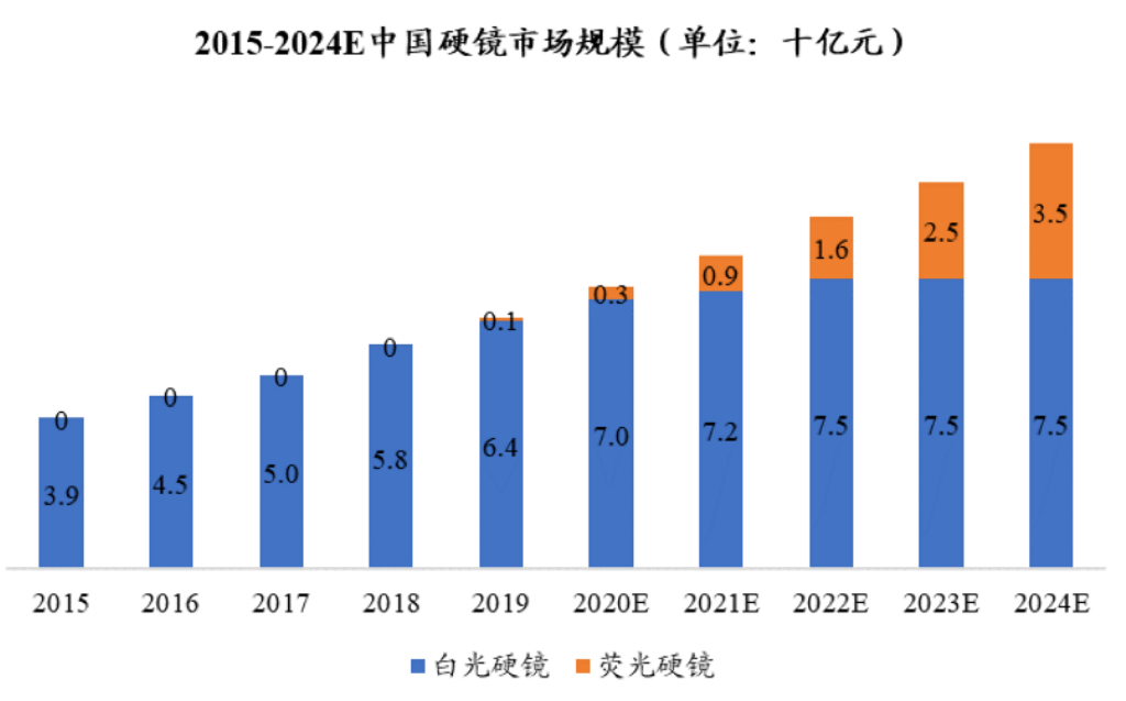 硬鏡的應用在全球範圍內已經相對成熟,近年來保持穩定增速。全球硬鏡的市場規模由2015年的46.4億美元增長至2019年的56.9億美元,期間年複合增長率為5.2%;預計未來全球硬鏡市場整體增速略微放緩,將以4.9%的年複合增長率增長至2024年的72.3億美元。全球熒光硬鏡市場初步發展於2015年,隨著熒光硬鏡技術的逐漸成熟,近年來被廣泛應用於腹腔鏡等臨床手術。由於熒光整機係統兼具了白光和熒光內窺鏡功能,一體化產品有助於減少手術室設備配置,並提升科室診療能力,因此熒光產品的市場規模及占比逐年提高。2019年全球熒光硬鏡的市場規模達到13.1億美元,占總體硬鏡市場的比重為22.9%;預計未來將呈現高速增長,以24.3%的年複合增長率增長至2024年的38.7億美元,占比逐步提高至53.5%。