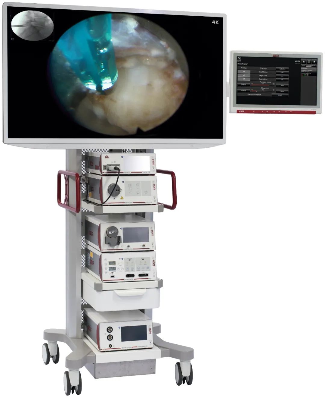 Richard Wolf提供的RIWOmobil台車是一款緊湊型多功能係統,可單獨配置。建議在此器械車上裝配 55”4K 顯示器。理想情況下,31”4K顯示器應安裝在專門設計的彈簧臂上。另外,它還可以安裝到專用的移動式滾動支架上,以便在不同的手術室中使用。