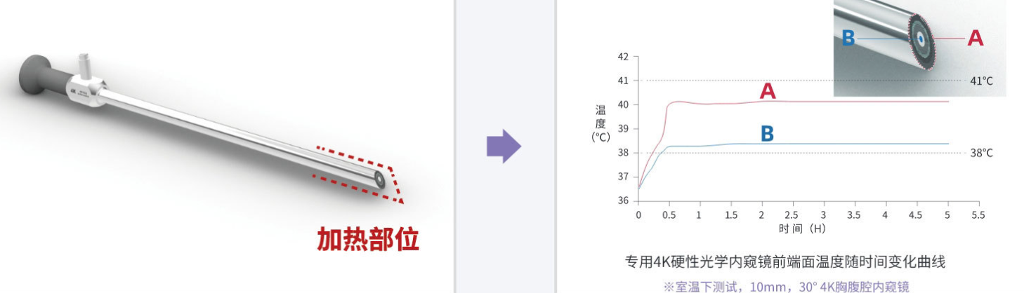 2.前端加熱:使用專用的4K硬性光學內窺鏡,可保持鏡體前端持續加熱,從而有效避免因溫差產生的煙霧現象,使視野清晰。
