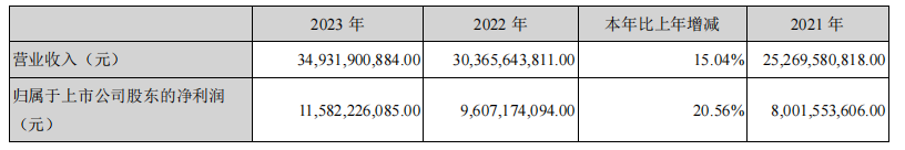 1、營業收入349.3億元,同比增長15%;歸母淨利潤115.8億元,同比增長20.6%;扣非歸母淨利潤114.3億元,同比增長20%。