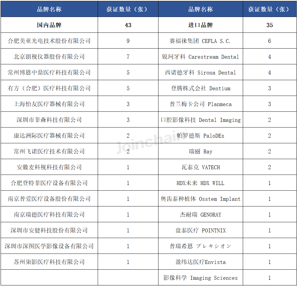 inkMacSystemFont, "Helvetica Neue", "Hiragino Sans GB", "Microsoft YaHei UI", "Microsoft YaHei", Arial, sans-serif; font-size: 17px; letter-spacing: 0.544px; text-align: justify; text-indent: 0px; line-height: 1.75em; box-sizing: border-box !important; overflow-wrap: break-word !important;">近年來,國內(nei) CBCT產(chan) 品數量高速增長,在2021年及2022年迎來產(chan) 品注冊(ce) “井噴”,兩(liang) 年共新增CBCT產(chan) 品注冊(ce) 證54張,國產(chan) 品牌CBCT注冊(ce) 證數量也在2022年成功反超進口品牌。截至目前,國內(nei) 共有78張口腔CBCT產(chan) 品注冊(ce) 證,其中國產(chan) 品牌注冊(ce) 證43張,進口品牌注冊(ce) 證35張。