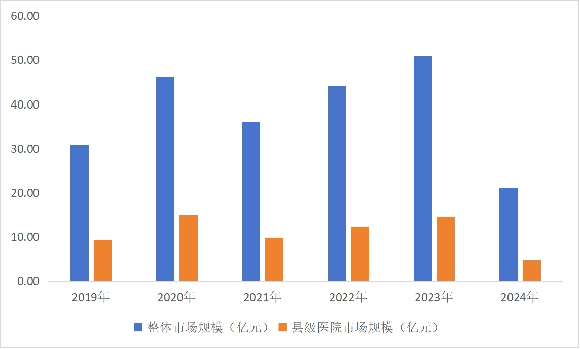 2019-2024年國內(nei) 公立醫療機構呼吸機整體(ti) 及縣域市場采購規模變化情況